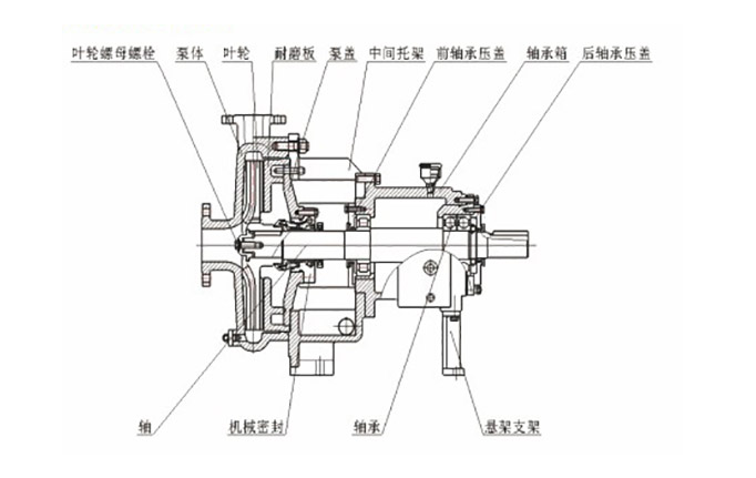 5)葉輪(lún)輪毂與泵(beng)蓋間有較(jiao)大的錐形(xing)空間,防止(zhǐ)固相介質(zhi)進入軸封(fēng)。