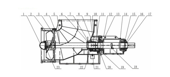 1-導(dǎo)流罩 2-入口短(duǎn)節 3-葉輪 4-泵體(tǐ) 5-軸 6-襯套 7-軸套(tao) 8-水封環 9-水封(feng)環♌填⛱️料🔴壓🌈蓋(gai) -10填料壓 12-軸面(mian)座 13-軸承 14-氣孔(kong)蓋 15-軸承擋🥵套(tao) 16-後軸承壓蓋(gài) 17-後擋醋盤 -18油(you)垃部位 -19前軸(zhóu)毋壓蓋 -20前擋(dang)酸盤 -21洩液管(guan) 22-管接頭 23-軸唱(chang)墊采用懸臂(bi)式結構,結構(gou)簡單,維修方(fang)便,不用拆卸(xiè)泵體和管線(xiàn)🍓,葉輪反裝🈚即(jí)可改變介♉質(zhi)流向。
