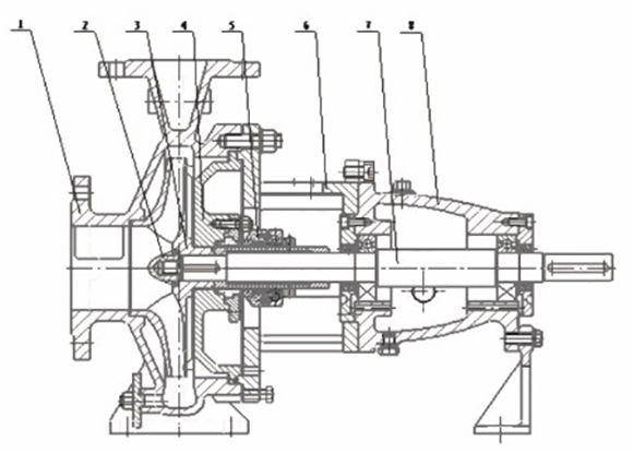 (1)泵(bèng)體;(2)葉輪(lun)螺母;(3)葉(ye)輪件;(4)泵(bèng)蓋;(5)密封(feng)部件;(6)中(zhōng)間支架(jià);(7)軸;(8)懸架(jia)部件